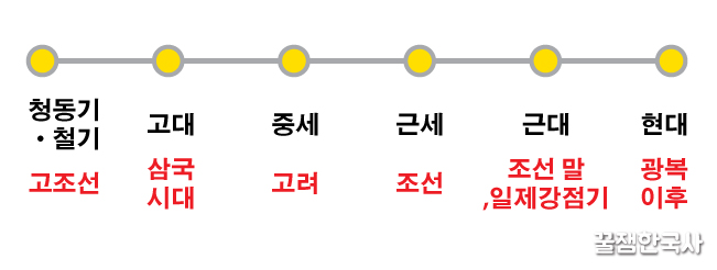 청동기·철기는 고조선이라고 보면 되고, 고대는 삼국시대, 중세는 고려, 근세는 조선이야. 그리고 근대는 조선 후기(교과서는 흥선대원군 집권기부터라고 보고 있음) + 일제강점기라고 보면 되고, 마지막으로 현대는 광복 이후야.