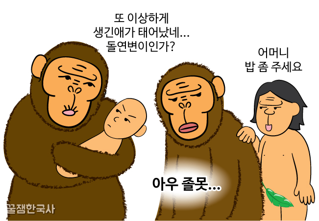 이들이 지구에 서식한지 수백만년이 흘렀을 때, 어느 날 갑자기 머리도 크고 털 숱도 적고 더 똑똑한 돌연변이들이 태어나기 시작하는 거야.