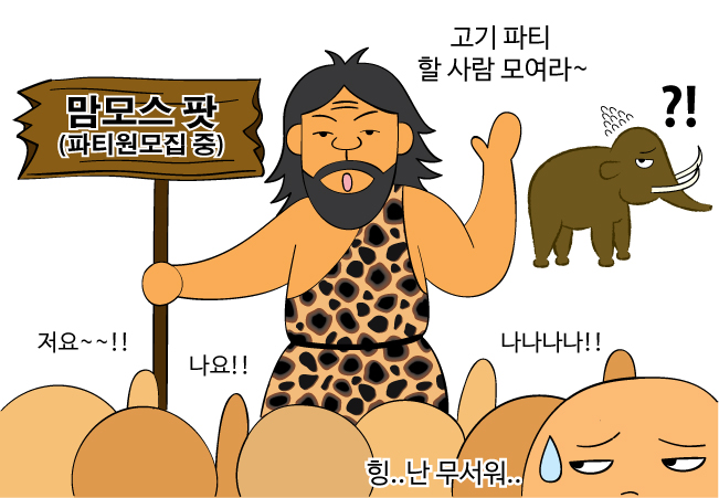 근데 맘모스를 때려잡은 후에도 사람들이 파티 해체를 하지 않고 이왕 이렇게 모인 거 같이 살기 시작하는 거야.