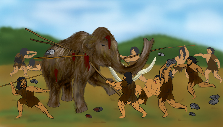 이렇게 도구를 사용하면서 인간은 강해지긴 했지만, 도구만으로는 맘모스와 같은 큰 동물과 1대1로 맞짱을 떠서 이기기에는 불가능했지.