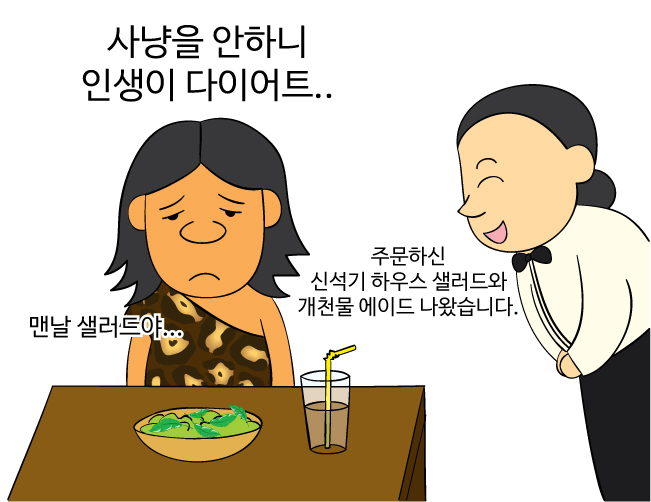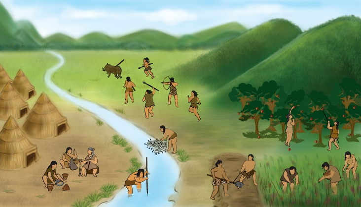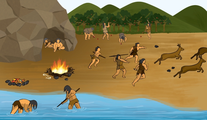 돌아다니면서 과일 같은 열매들을 따먹고, 물고기 잡아먹거나(어로), 맘모스 같은 짐승들을 사냥하면서 식량을 구했지.