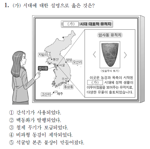 선사시대 문제는 꼭 하나씩 출제되는데, 이런 그림 보여주면서 '다음 중 이 도구를 쓴 시기의 설명에 대한 글로 옳은 것은?' 이딴 식으로 나와.