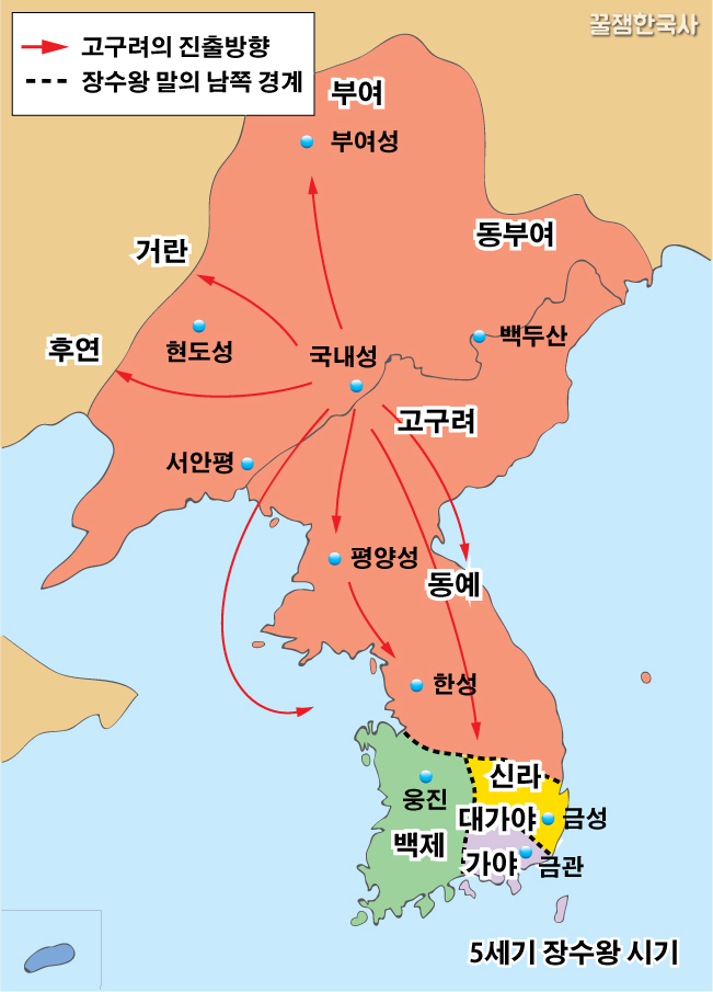 그리고 난 후 병력을 남쪽으로 돌려서 평양으로 천도<★★>한 뒤에 남진정책을 추진하여 백제를 두들겨 패버린단다.