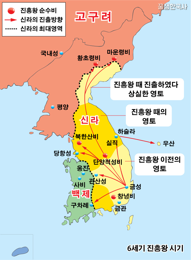 마지막으로 진흥왕 파트에서 알아둬야 할 것은 전쟁에 승리하여 영토를 넓힐 때 마다 순수비<★>를 세웠다는 것이야.