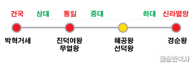 박혁거세부터 진덕여왕 까지를 신라 상대라고 하고, 무열왕부터 혜공왕까지를 신라 중대, 선덕왕부터 경순왕까지 신라 하대라고 해.