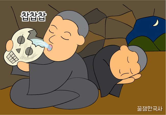 원효대사 해골물 사건 알지? 의상대사랑 당나라로 유학을 가는 중에 해골물 마신 후 깨달음을 얻고 당나라 유학을 포기했잖아.