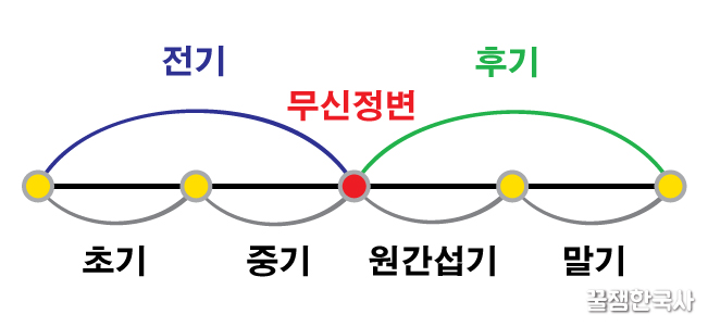 그것을 다시 4개로 쪼개면 전기는 초기와 중기로 나뉘어지고, 후기는 원간섭기와 말기로 나뉘어.