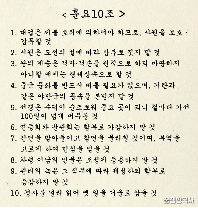 왕건은 첫 왕답게 훈요 10조<★>를 지어서 후대의 왕들에게 권고를 했고,