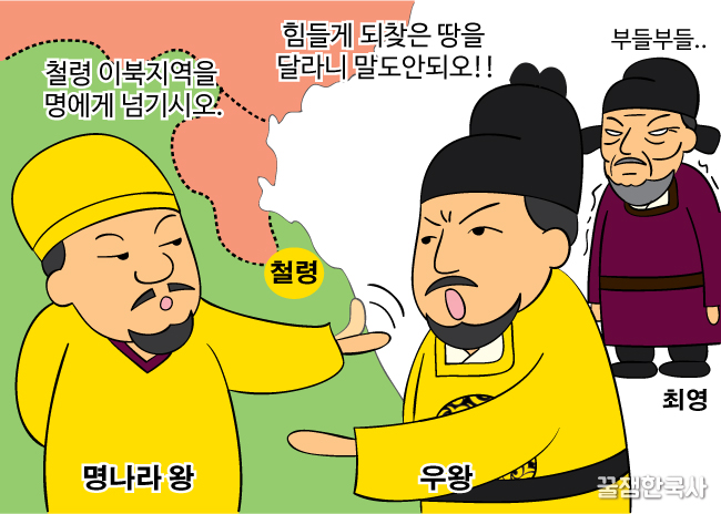 이때는 중국이 원나라에서 명나라로 교체되는 시기였는데, 명나라가 철령이북(원나라에게 빼앗긴 땅)에 철령위를 설치하고, 그 땅을 자기들이 갖겠다고 하는 거야.