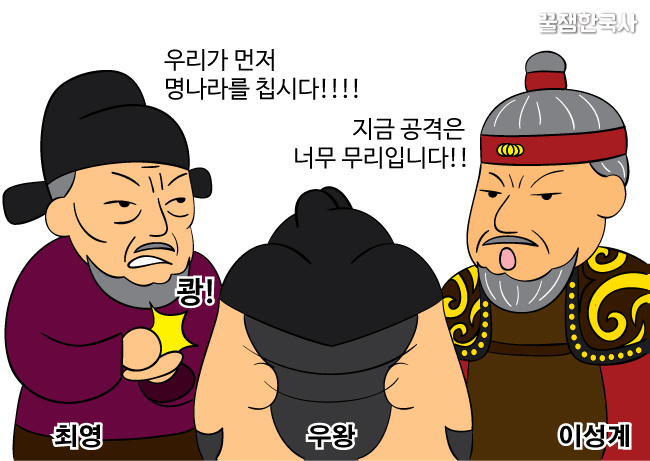 최영을 중심으로 하는 세력은 명을 정벌하자고 주장했고, 이성계를 중심으로 하는 세력은 지금 전쟁을 하기에는 너무 시기가 좋지 않다고 주장하는 거지.