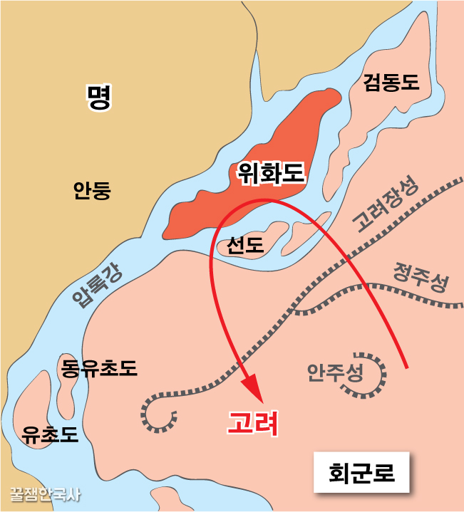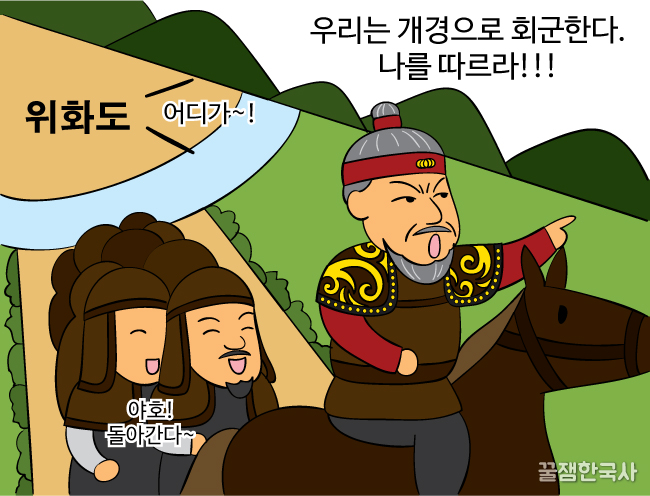 이에 따라 4불가론을 내세워 위화도에서 명을 정벌하러 출진한 군사들의 칼날을 죄다 궁궐로 돌려버려.