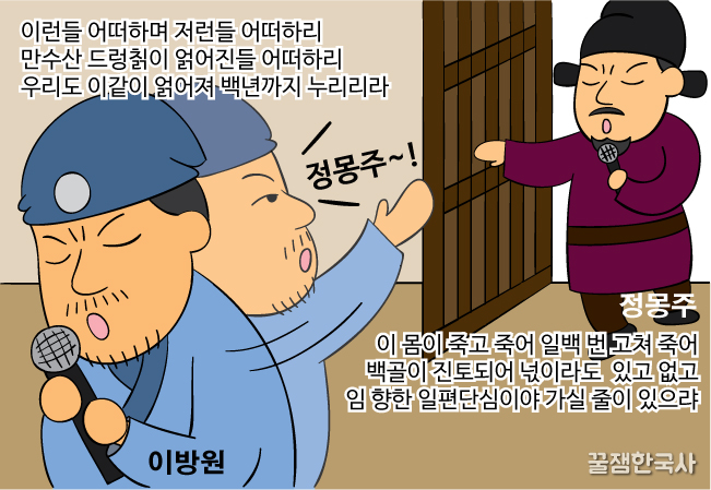 이렇게 하여가와 단심가를 주고받으며 이방원의 제안을 정몽주가 쿨하게 거절해.