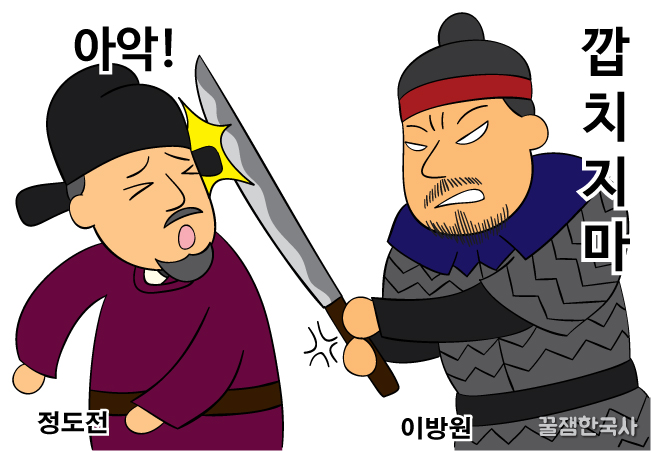 몰래 키운 군사를 갑자기 동원하여 무력을 앞세운 이방원이 정도전을 체포해서 그 자리에서 죽이고, 게다가 자신의 이복동생인 세자 이방석까지 살해하지.(1차 왕자의 난)