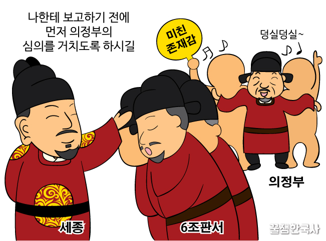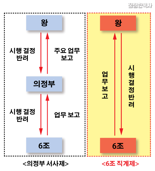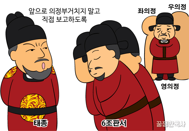 6조(형조,공조,예조 등.... 지금의 국방부, 보건복지부, 통일부 등...)에서 의정부를 거치지 않고 왕에게 직접 보고를 하는 거야.