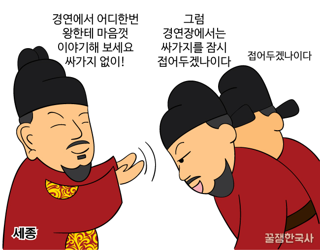 그리고 집현전에서 경연을 열어서 신하들과 대화를 많이 나눴지.
