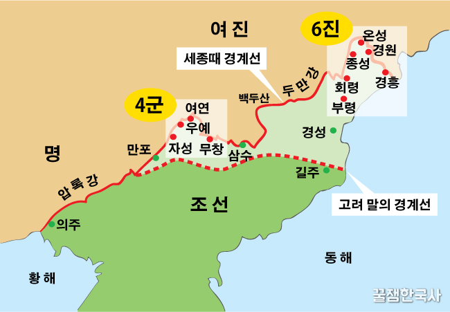 4군 6진을 개척했고, 이종무를 시켜 쓰시마섬(지금의 대마도)을 정벌<★★>하는 등으로 영토 확장을 했단다.
