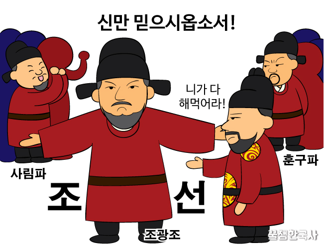 조광조가 훈구파를 너무 심하게 까대니까 훈구파의 반격에 숙청당한 사건이 기묘사화야.