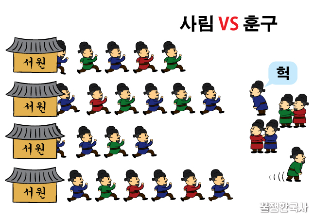 조선 초기에는 훈구파가 조정을 장악하고 있었다가 사화(선비(사림)들이 입은 화)를 거치면서 사림파가 결국 훈구파를 몰아내고 역사의 주도세력이 됐잖아.