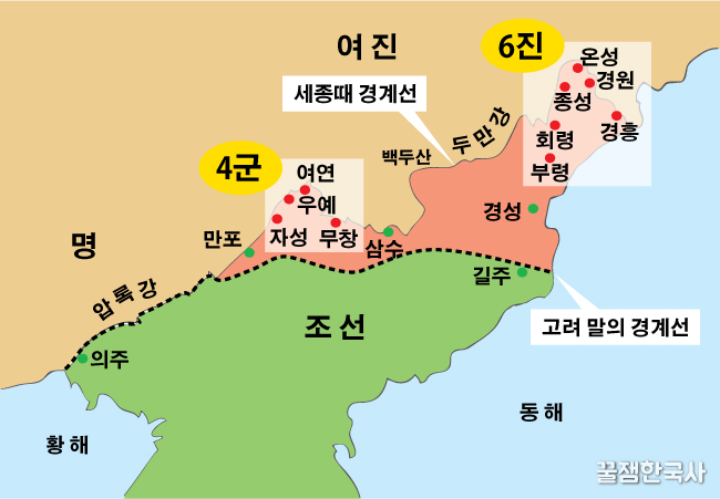 세종 때 여진족 땅을 쳐서 4군 6진을 개척했다고 했지? 저기에 사민정책(백성들 이주시키는 정책)을 펼쳐.