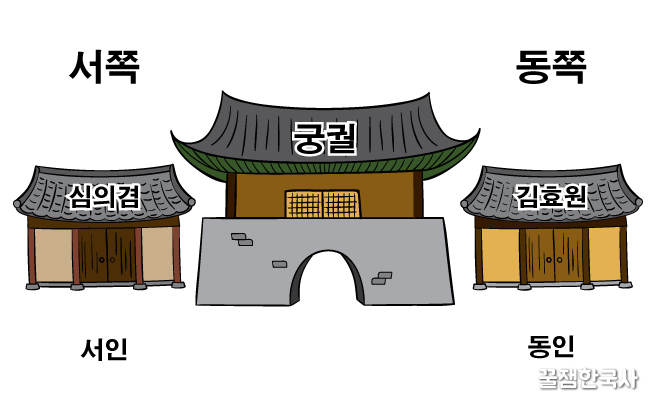 김효원 집은 동쪽에 있고, 심의겸 집은 서쪽에 있어서 그를 따르는 무리들을 동인 서인이라고 했어.
