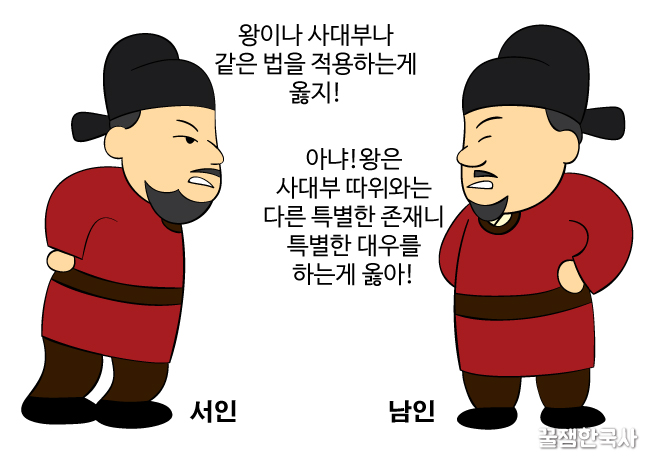 현종의 아버지인 효종은 둘째 아들이었는데, 그가 죽고 나자 원칙대로 차남의 대우를 할 것인지, 왕이니까 특별히 장남처럼 대우할 것인지 다투게 돼.