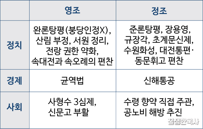 시험에서 영조의 업적과 정조의 업적을 보기에 섞어 놓고, 각 왕의 업적을 골라내는 문제가 출제 돼.