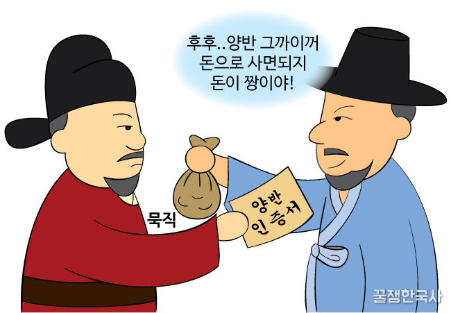 공명첩으로도 양반 신분을 살 수 있지만 꽤나 비싸단 말이야. 따라서 이런 불법적인 매매가 성행한 거지.