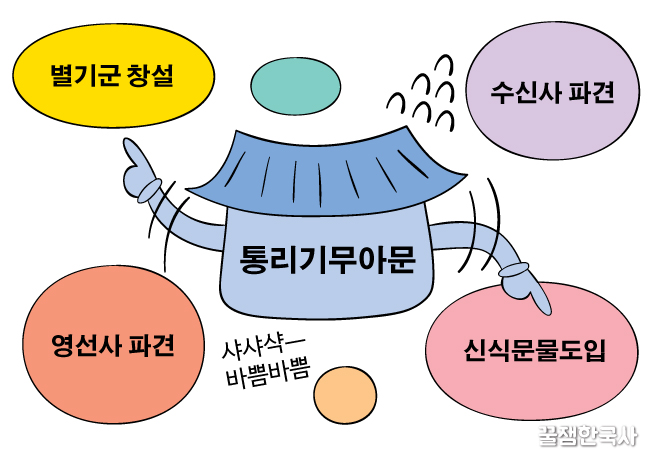밑에 12사를 두고 별기군 창설, 조사시찰단과 영선사를 파견하는 등의 일을 했단다.