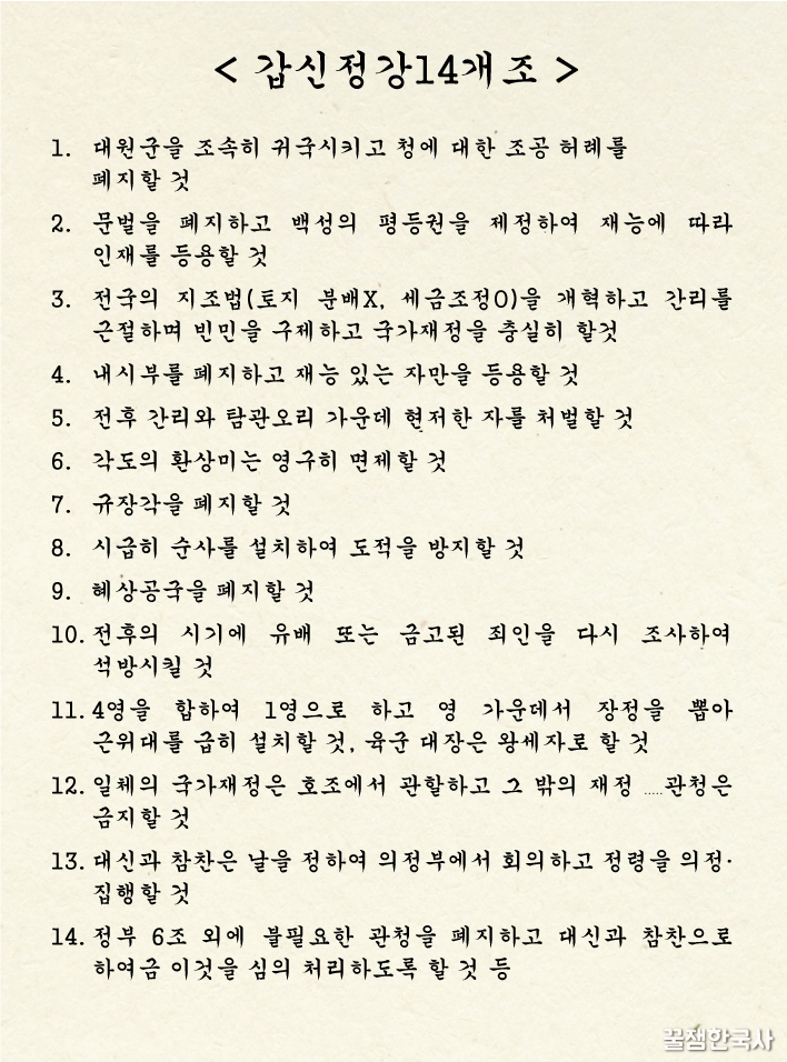 어찌됐든 고종이 창덕궁으로 다음 날인 12월 5일에 돌아가고, 그 다음날인 6일 오전에 급진파는 갑신정강 14개조를 발표해.