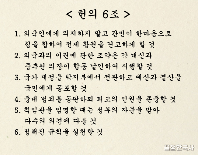 이렇게 민중의 주장이 담긴 헌의 6조를 독립협회가 고종에게 들이밀자, 이의 일부의 승인을 받아내어 '조칙 5조'를 발표하지.