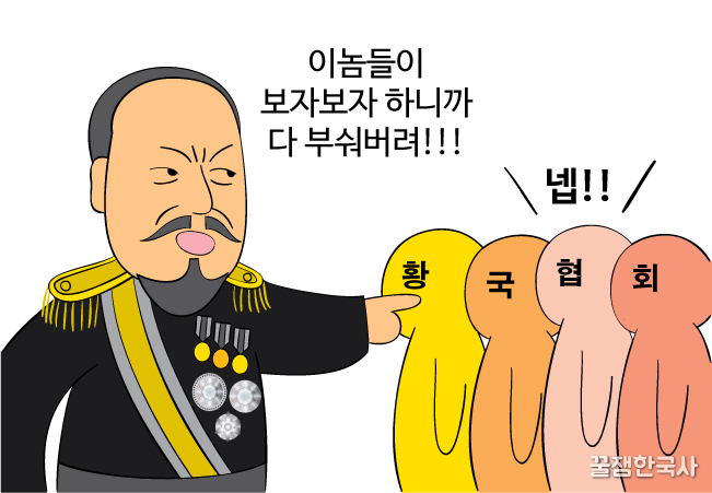 보수파와 일본의 모략으로 독립협회가 입헌군주제가 아닌, 황제를 폐위하고 공화국을 세우려한다는 헛소문이 고종의 귀에 들어가.