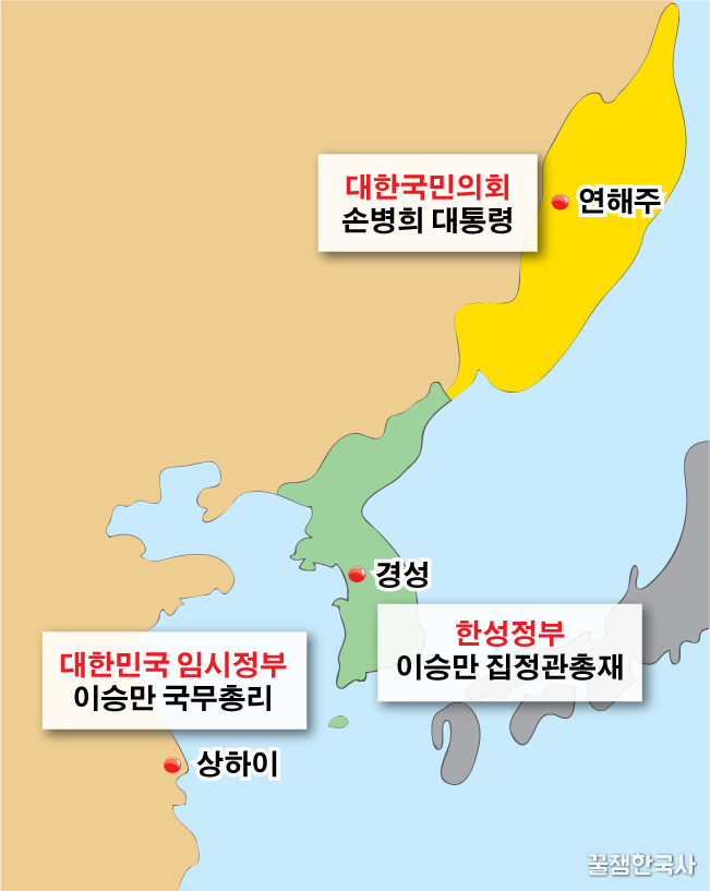 ● 대한국민의회·대한민국임시정부·한성정부. 대한민국임시정부로 통합(법통성은 한성정부의 것을 채택). 이승만 대통령. 민주공화제. 삼권분립.