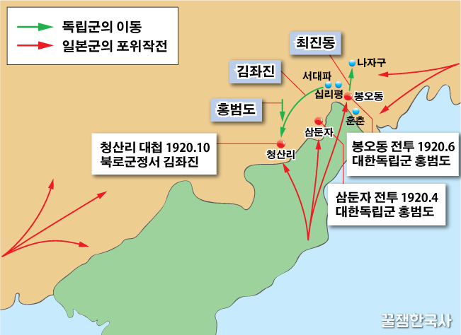 ● 일본군이 포위망 좁혀옴 → 김좌진의 북로군정서, 홍범도의 대한독립군 등은 청산리 백운평을 시작으로 전투 개시 → 갑산촌, 어랑촌 등 10여 차례 전투에서 일본군 사살
