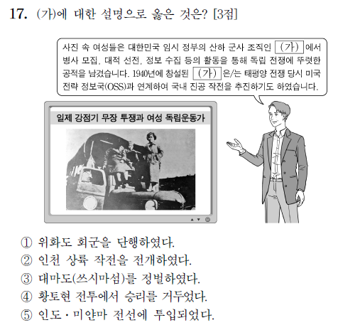 ● 한국광복군. 일본에 선전포고. 세계2차대전 연합군. 조선의용대 흡수(1942). 중국정부와 협력. 영국군과 함께 미얀마·사이판·필리핀 전선에서 공동작전. 미군전략첩보군 OSS와 협약. 국내진공작전 준비.
