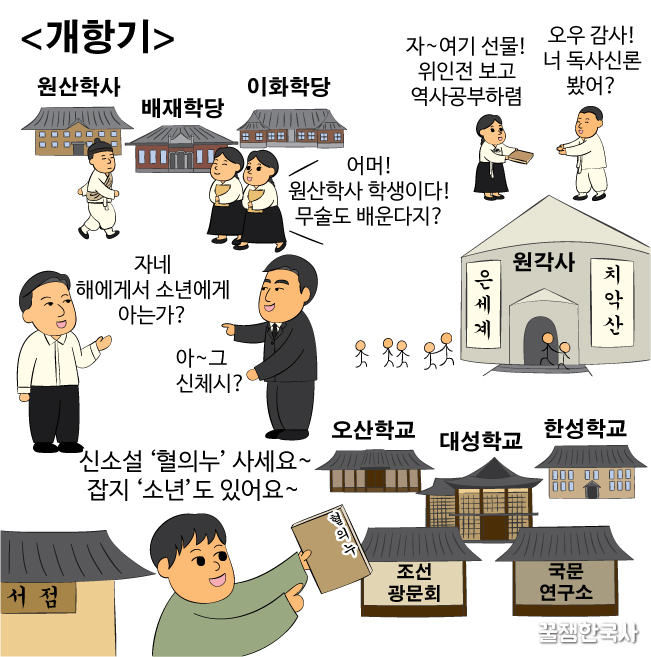 (1) 계몽사학이 유행을 해. 위인전(을지문덕전 이순신전 등)이나 다른 나라의 흥망사(베트남흥망사 등)가 많이 읽혔어.